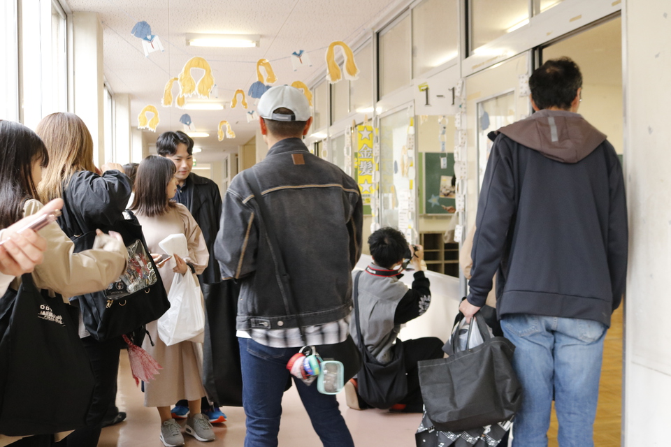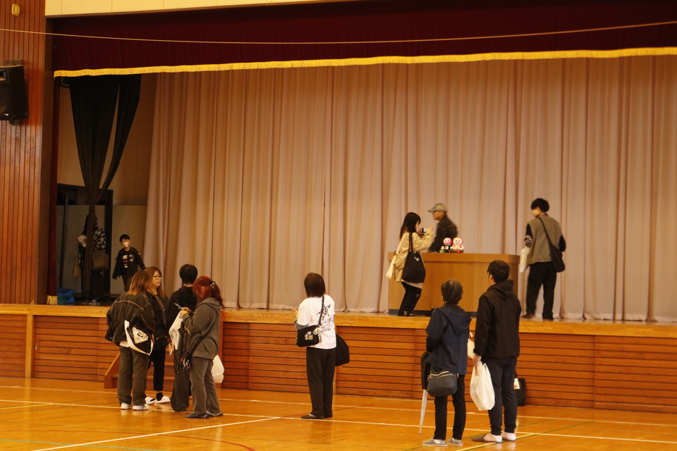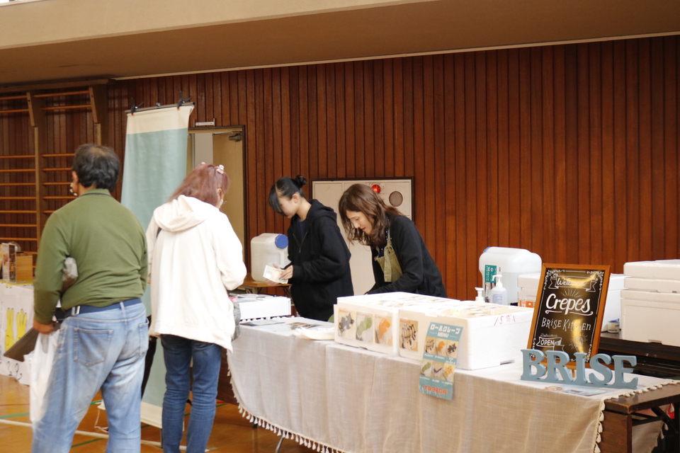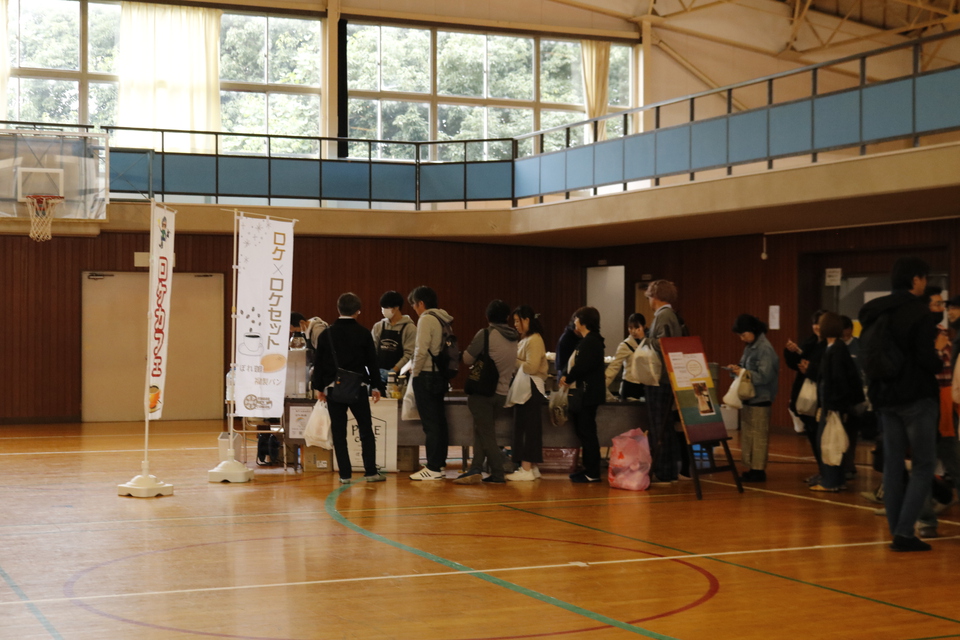 新体育館では撮影で差し入れされたロケロケセット(ぽれ珈琲「コーヒー」と福地製パン「揚げパン」がセット)、「BRISE kitchen」がクレープ、「2つ3つ」がシュークリームを販売いたしました。また、「大久保分校スタートアップミュージアム つくりえ-TSUCULIE」シルクスクリーン体験ワークショップを開催し、多くの方が体験されました。そのほか、ステージ上などで記念写真を撮影する姿も見受けられました。
