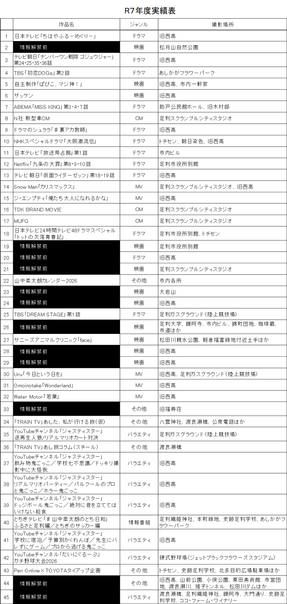 ■撮影件数:45件(映画:11件、ドラマ:12件、MV:5件、情報・バラエティ:8件、その他:9件)