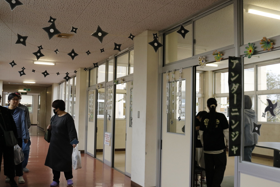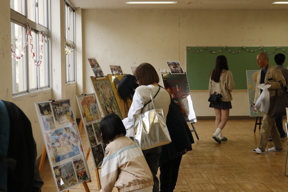 教室棟の1階では市内で撮影された作品のポスターを展示する部屋、映画のパンフレットを展示する部屋、映画「金髪」の場面写真などを展示する部屋がありました。2階は渡り廊下の部屋には映画「アンダーニンジャ」、教室の一つに映画「ババンババンバンバンパイア」の場面写真や撮影の様子を展示いたしました。