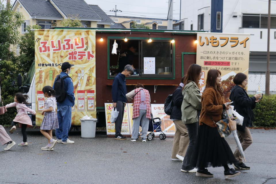 新体育館の外では「ねこにレモン」、「菊ちゃんラーメン」、「PKT」の3店舗がキッチンカーで出店し、レモネードやイモフライ、揚げピザなど様々なものを販売していました。